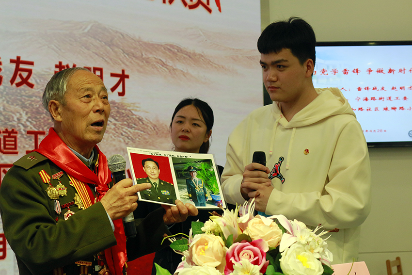 同学们认真聆听了赵明才老人做的专题报告。赵老身着军装,声音洪亮,讲述了自己的参军经历以及与雷锋的三次见面。“1960年11月,我是作为先进基层干部代表,与工兵十团节约标兵、优秀战士代表雷锋,一同出席沈阳军区工程兵连队政治工作会议。会上,我作了学习毛主席著作体会的汇报,雷锋作了忆苦思甜的报告,双双被树为标兵。”此后,赵明才又与雷锋有过两次见面。共同的理想信念在他们心中种下友谊的种子,赵明才和雷锋相约努力“做党的忠实儿子,以优异成绩到北京向党汇报,去见毛主席!”