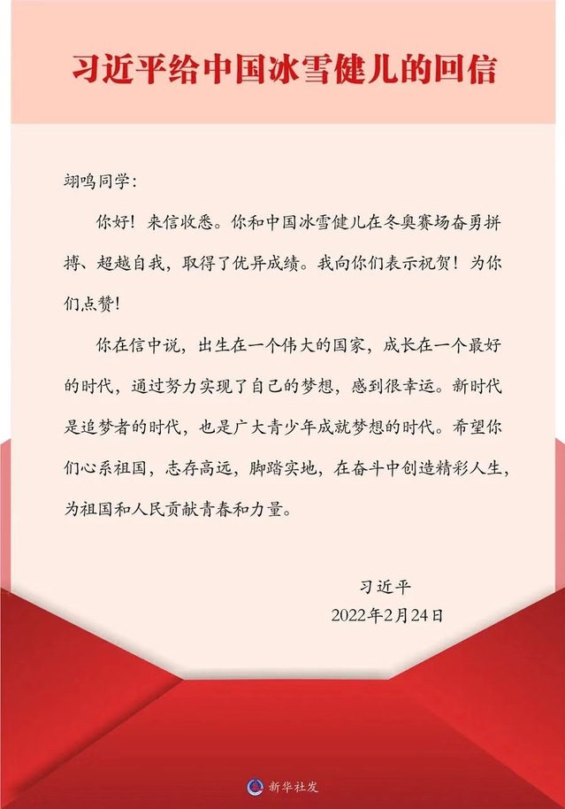 2月24日,中共中央总书记、国家主席、中央军委主席习近平给中国单板滑雪运动员苏翊鸣回信,向他和中国冰雪健儿取得优异成绩表示祝贺,并提出殷切期望。