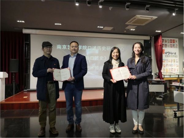 “昆曲口述史”项目启动仪式上,南艺科研处处长吕少卿、影视公司经理陈捷向昆曲艺术家、江苏演艺集团总经理柯军(姚锋代)、《新华日报》记者、《昆虫记》主编王晓映颁发艺术顾问聘书
