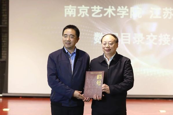 南京艺术公司党委书记杨明向江苏省档案馆馆长陈向阳移交首批电影人口述史目录数据