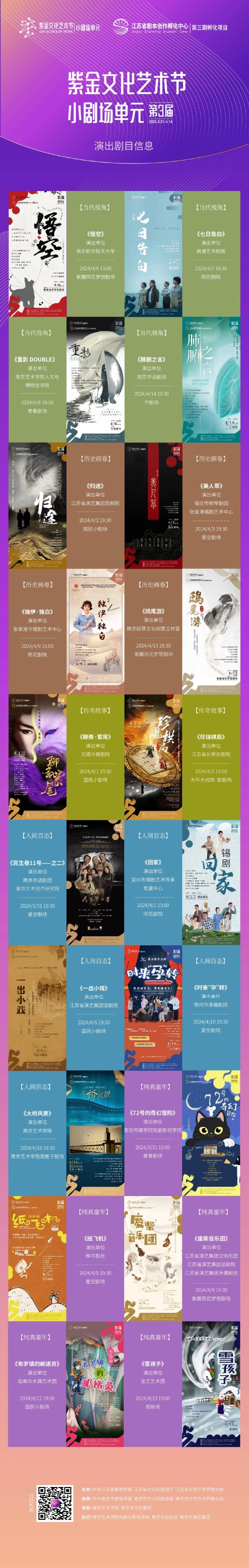 12部由省剧本创作孵化中心第三期培训营孵化的原创剧目,既有体现家国大义的现代戏曲《珍珑棋局》、昆剧《归途》,也有反映南京历史风貌故事的话剧《大桥风景》、话剧《一出小戏》,还有展现大爱传递的话剧《肺腑之言》,描写传奇故事的锡剧《聊斋·紫尾》,关注内心成长的儿童剧《72号的奇幻冒险》……